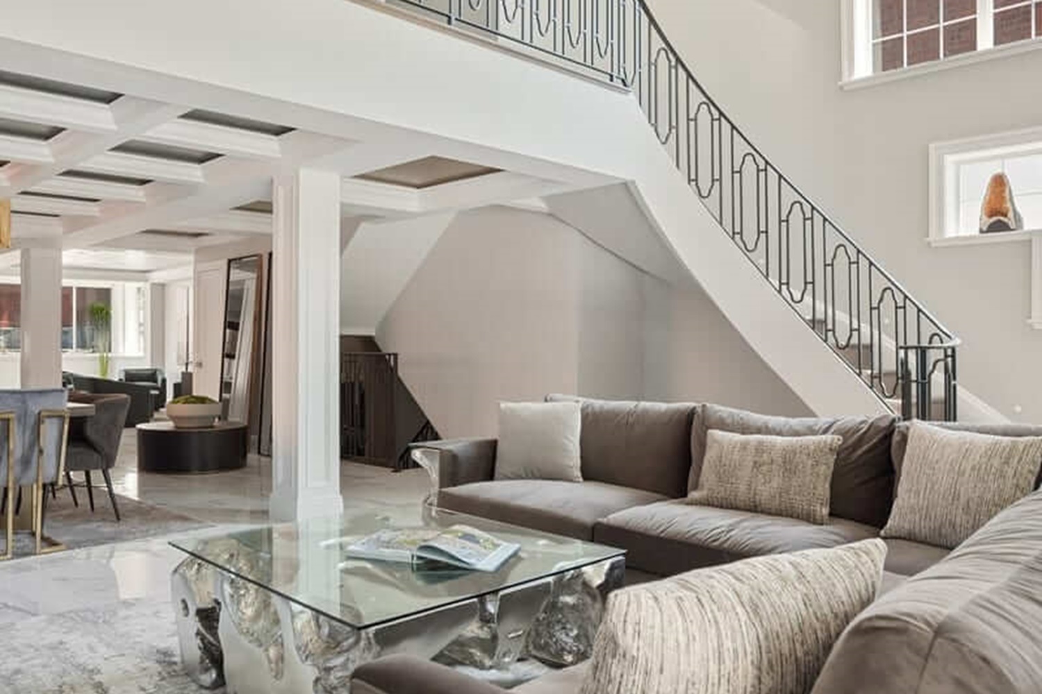 The room was closed off in several areas, with a large foyer that separated the entire space. We removed all of the partition walls and created a new location for the stairs to make the space look bigger and more inviting.
