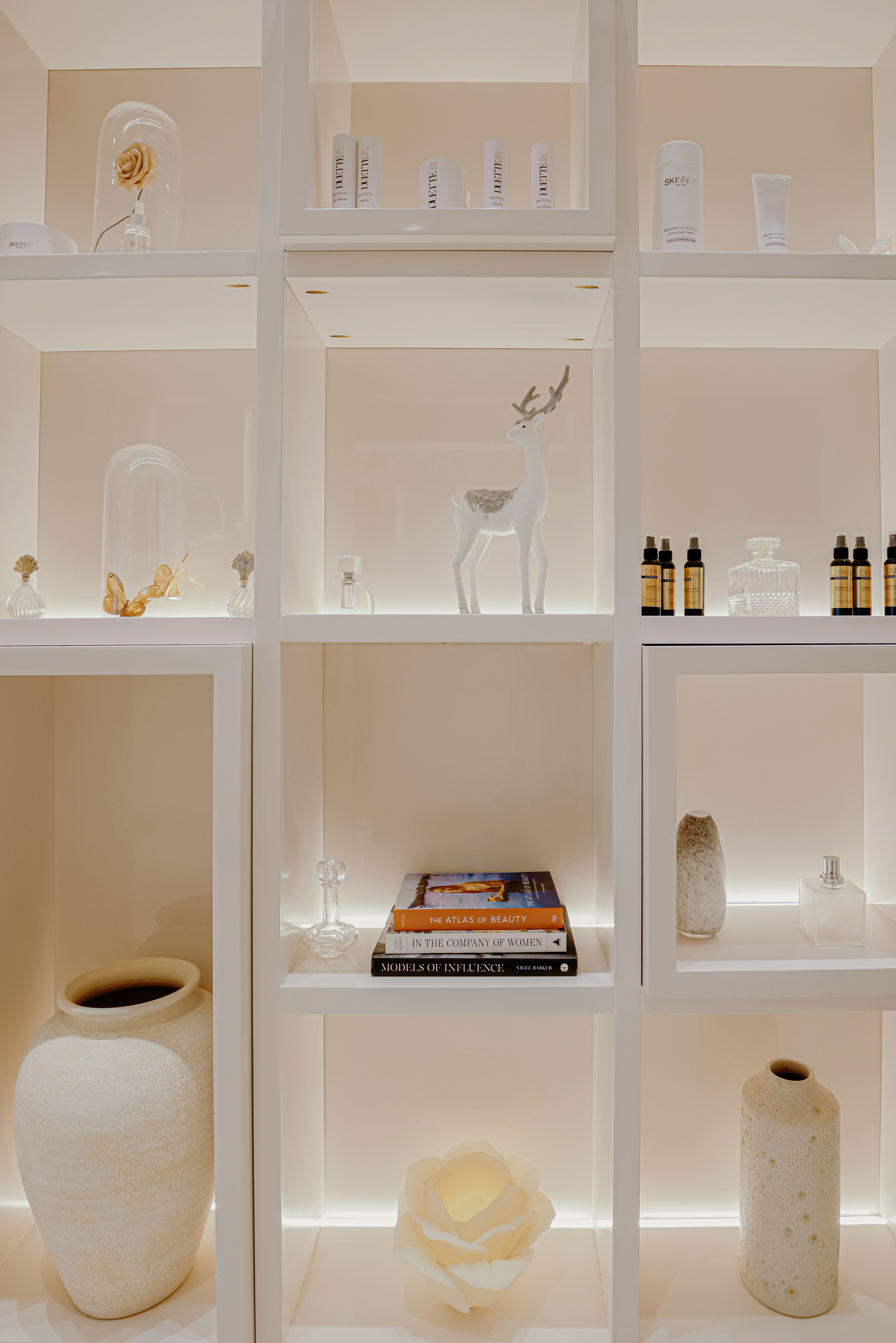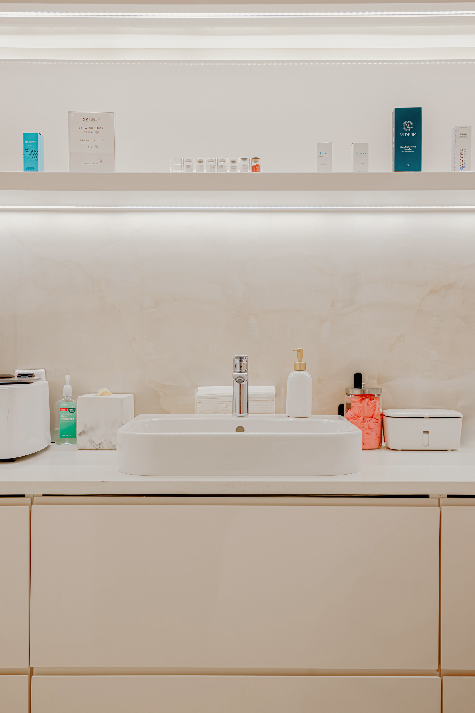 Custom shelving and lighting solutions were an important aspect of this commercial renovation project. The SKINNEY Medspa team needed adequate storage solutions that blended with their space while also immersing clients in the spa experience.